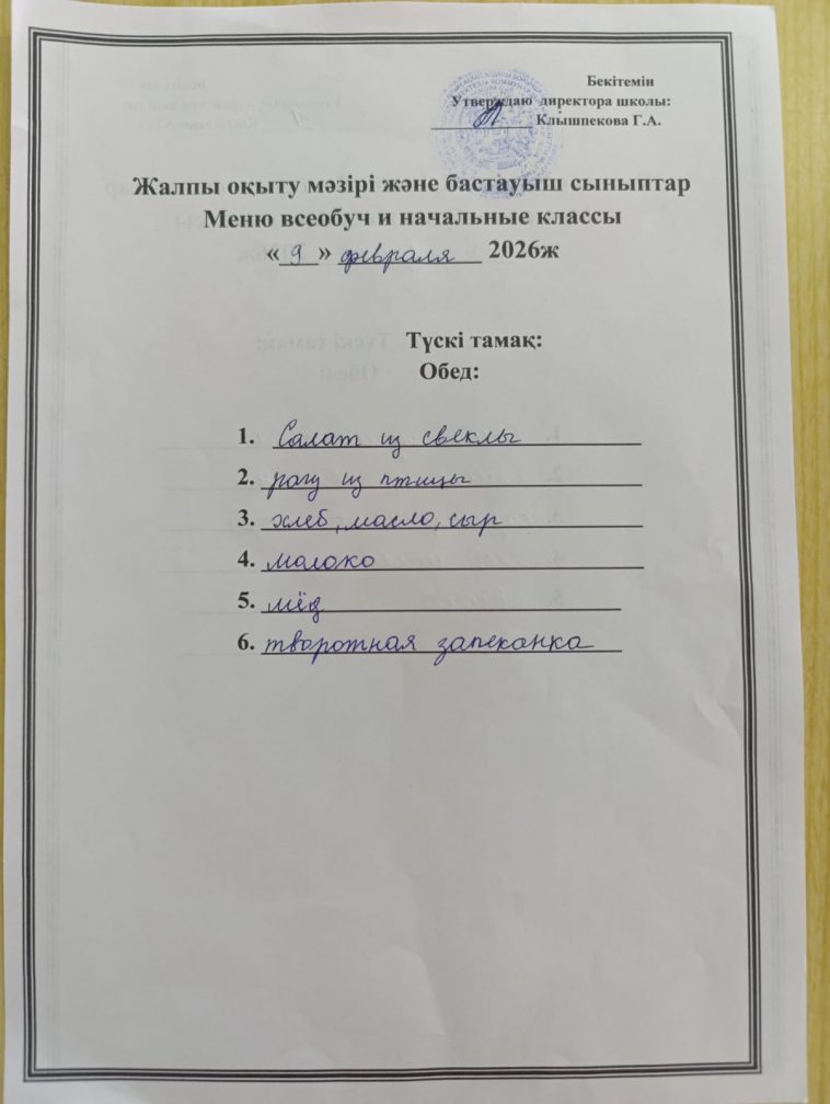 2026 жылғы 09 ақпандағы мәзір