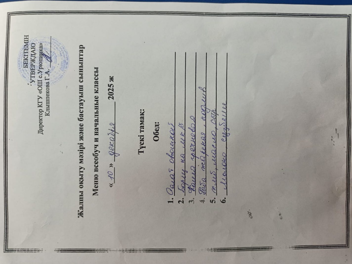 2025 жылғы 10 желтоқсанның мәзір